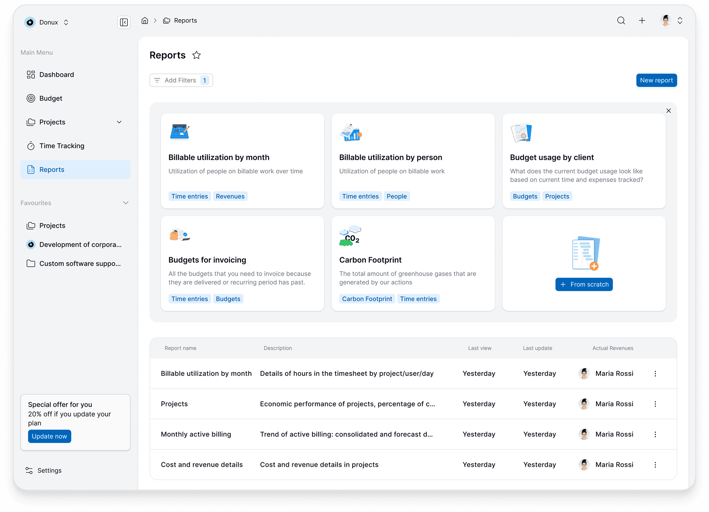 We applied user story mapping, starting from high-level stories and cutting down to define the MVP. The focus areas: budgeting, monitoring and tracking, reporting, and integrations. We defined a roadmap in three phases: style (visual identity), design platform, and a third phase for defining carbon accounting metrics together with the client.