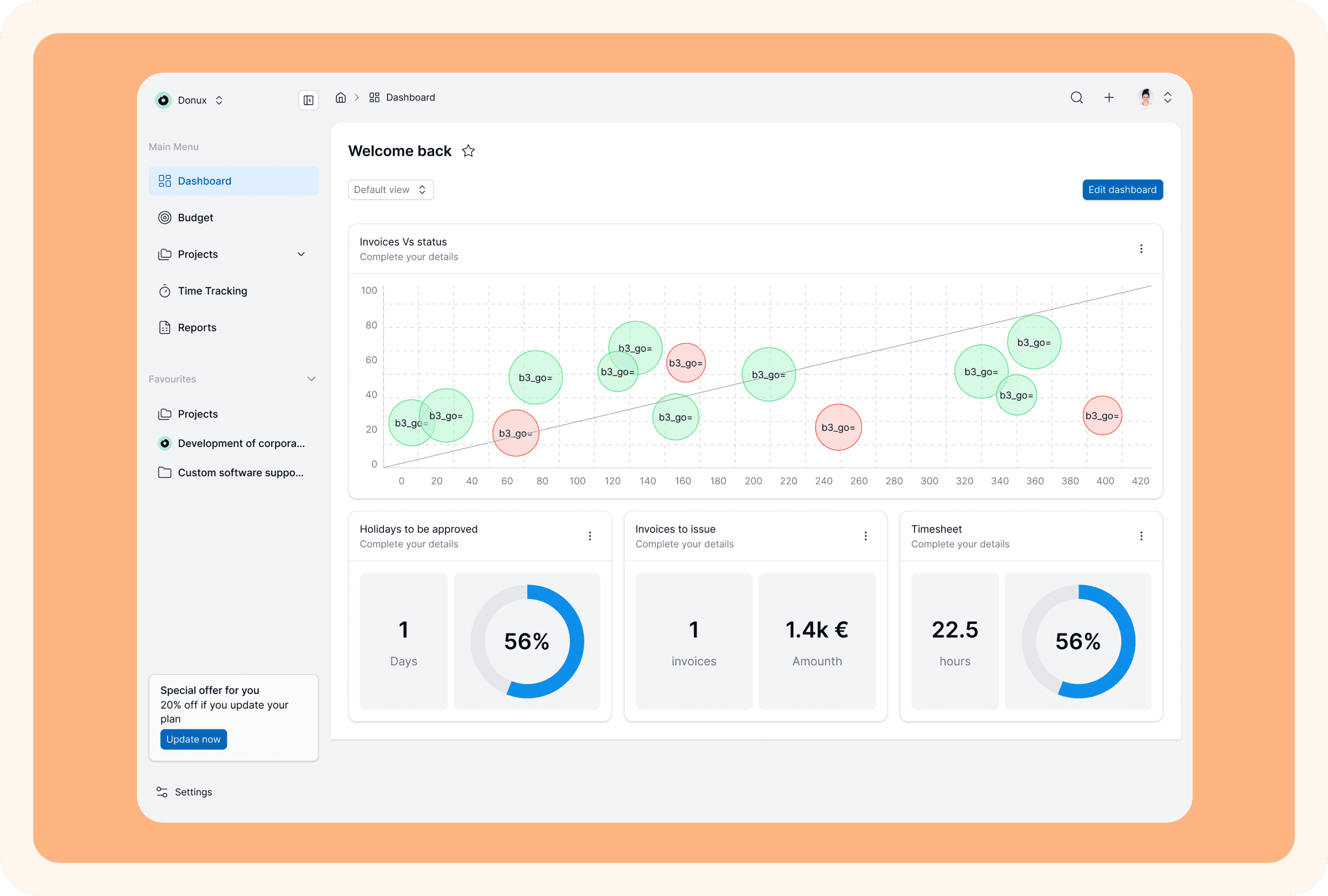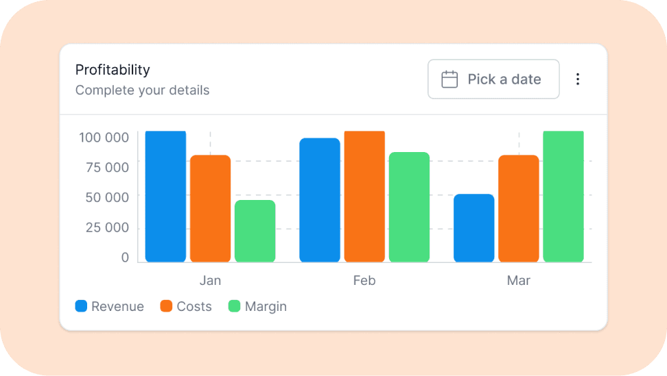 We worked with the client's supplier who handles environmental metrics. Together we mapped how CO2 emissions are calculated: by project type, number of people, whether employees work from home or office, commuting patterns, and expense reports. All these variables were integrated into the platform's company configuration. Through workshops, we defined must-have, nice-to-have, and not-needed-now information for the dashboard. We designed custom widgets and defined accessible color palettes (categorical, monochromatic, diverging).